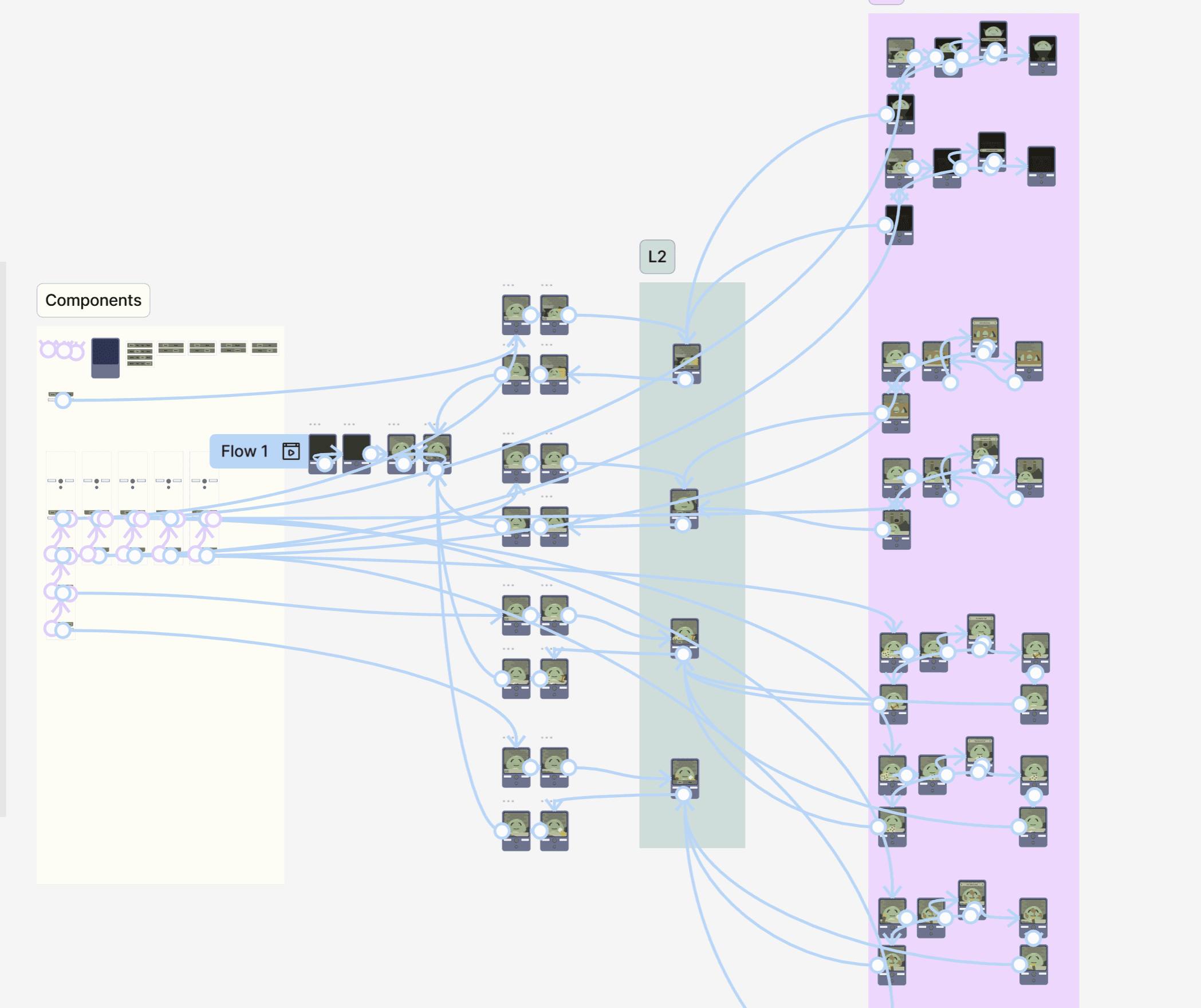 As I was creating the final figma prototype I had to ensure I stay organized. Since I was pulling in so many videos from after effects, I made sure they were organized by which specific menu they fell under. When moving along to prototyping all of my components and frames I made sure to stick level two interactions all together. Level three interactions had their own section, and were grouped by proximity to their specific sub classes. Components also had their own section to keep up with the organization.
